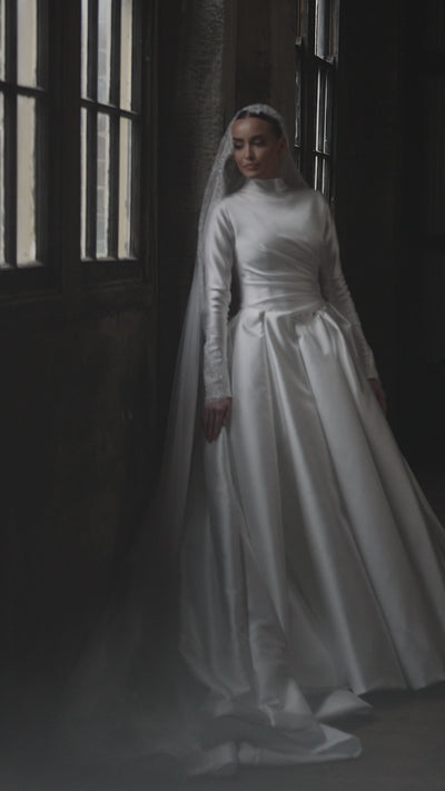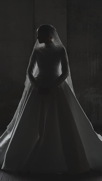 Step into a realm of regal allure with our luxurious silk Mikado ballgown, with a built in corset,our signature buttons on the back and sleeves a masterpiece of classic sophistication and modern design. This gown features an expertly tailored bodice with elegant draping, French lace detailing on the waistline and sleeves, leading the eye to the distinctive V waistline. The voluminous skirt, crafted from rich silk Mikado, flows into a dramatic ball gown silhouette.