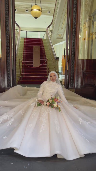 Long fitted sleeves and a graceful buttoned back add a touch of vintage romance, while the full skirt flows into a majestic train for a truly royal finish. The Kishama gown is perfect for the bride who desires a modest yet opulent look, blending tradition with couture artistry.