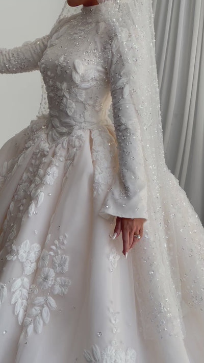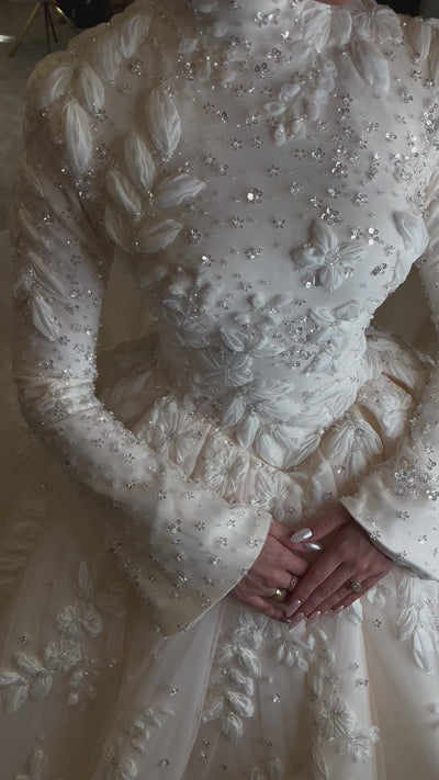 The Kishama gown is a vision of regal elegance and timeless sophistication. Crafted with a high neckline and fitted bodice, it features intricate 3D floral appliqués, delicate hand-beading, and shimmering crystal details that cascade through the voluminous skirt. Each element is thoughtfully designed to capture light and movement, creating a breathtaking bridal statement.