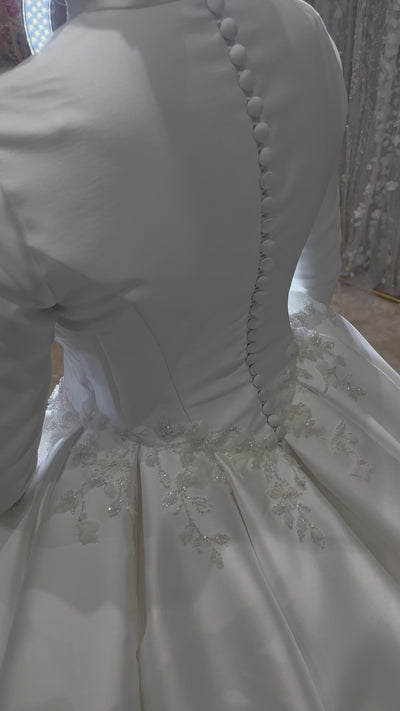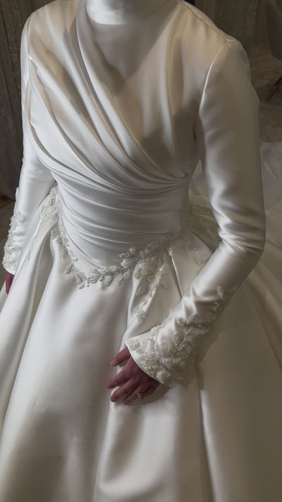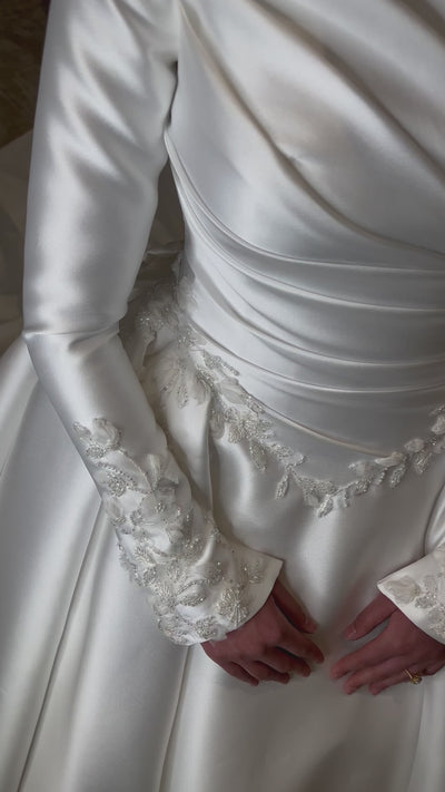 The Mona gown is the epitome of refined elegance and modern modesty. Crafted from luxurious satin, this gown features a beautifully draped high neckline that flows seamlessly into a softly ruched bodice, sculpting the waist with graceful precision. Subtle lace appliqués and delicate beadwork adorn the waistline and cuffs, adding a touch of romance to its sophisticated silhouette.