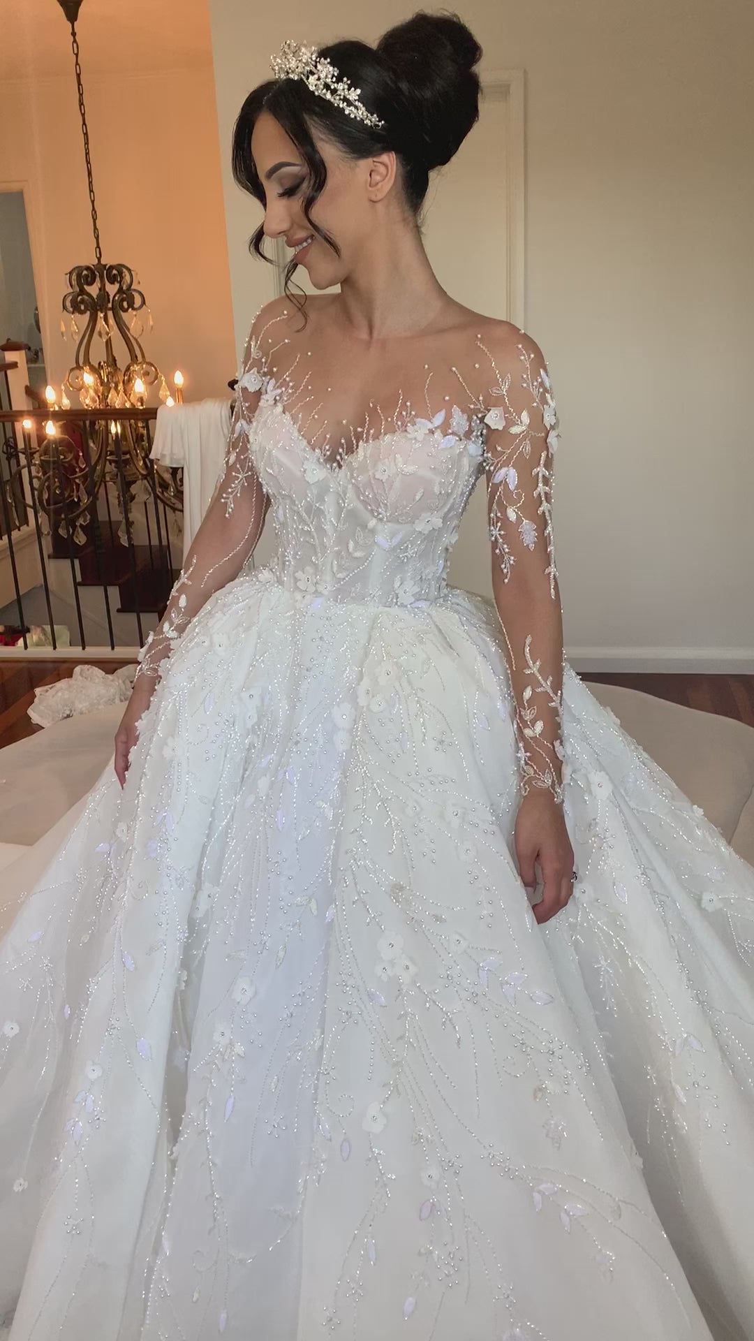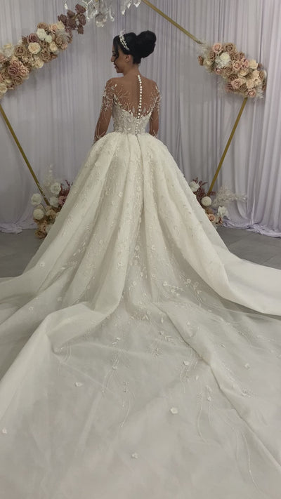 The Selina gown is a vision of refined elegance and intricate artistry. Designed with a structured bodice beneath a sheer illusion neckline, this gown features exquisite hand-beaded floral embroidery cascading from the fitted bodice into a voluminous skirt. Every pearl and crystal is meticulously placed, creating a soft shimmer that catches the light with every movement.