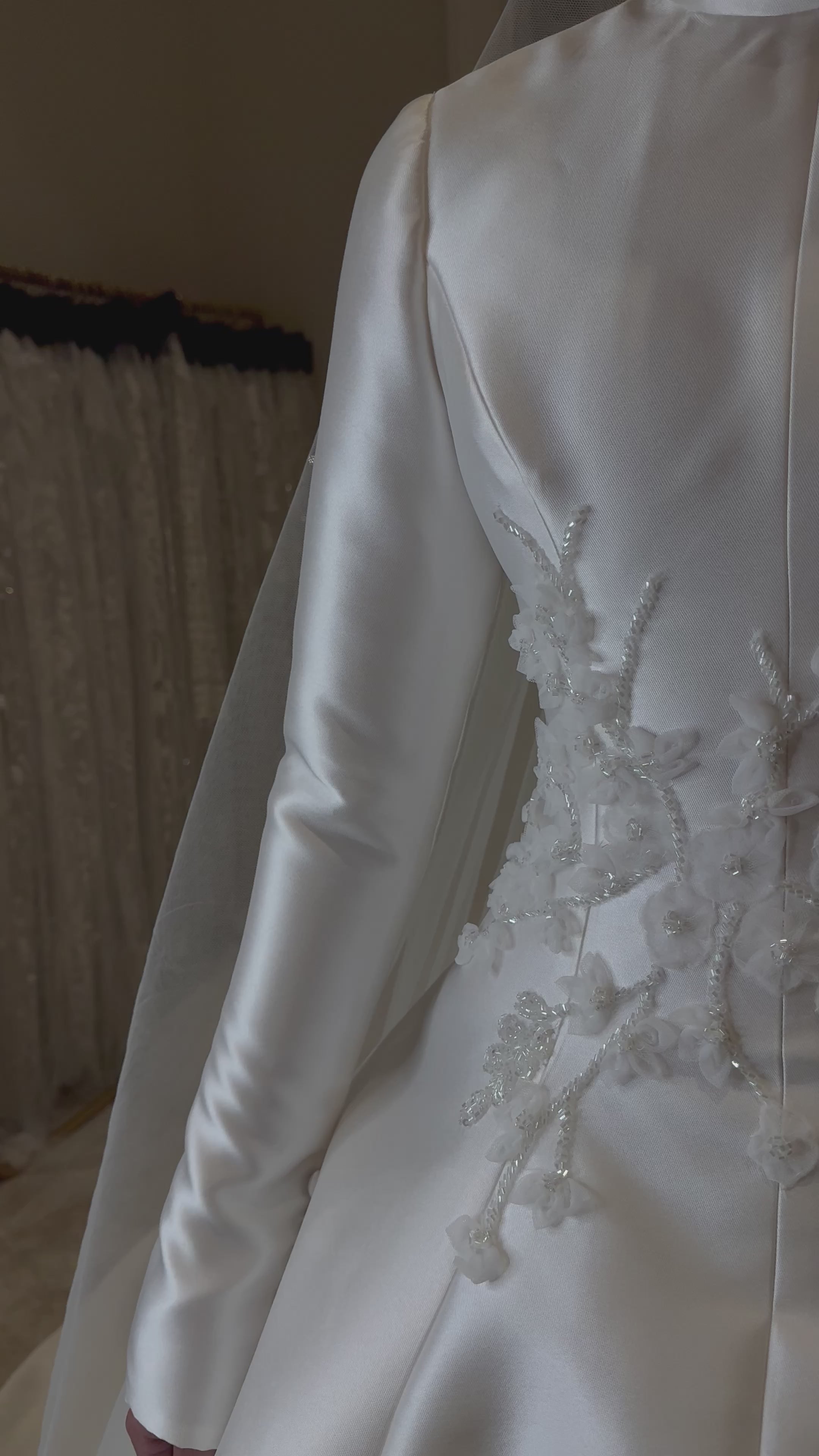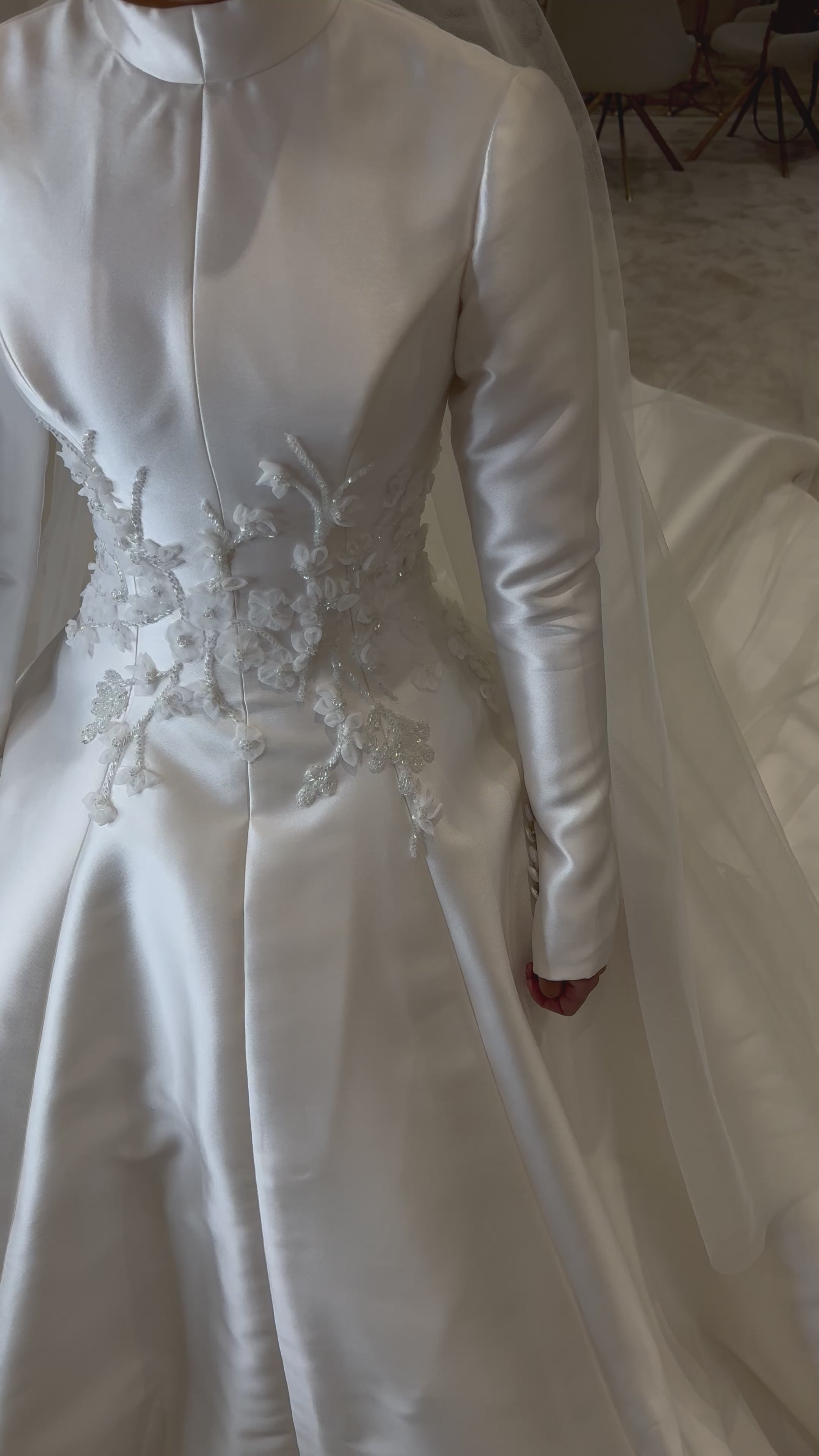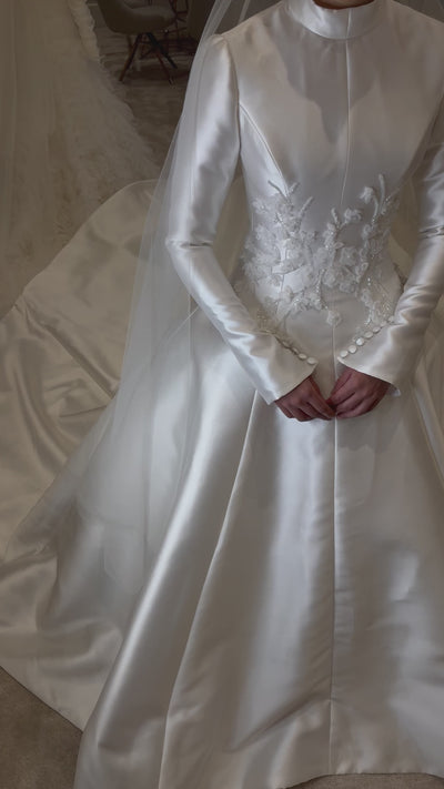 The Zahra gown is a timeless masterpiece of elegance and grace. Crafted from luxurious satin, it features a refined high neckline and long fitted sleeves for a look that embodies sophistication and modest beauty. The bodice is delicately embellished with hand-applied 3D floral appliqués and intricate beading, adding a romantic touch to its sleek silhouette.